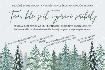 Tam, kde sníh vypráví příběhy Srdečně zveme studenty a zaměstnance školy na vánoční besídku. Besídka bude probíhat 18.12.2025 od 10 hodin ve školní jídelně. Můžete se těšit na tématické soutěže, bohatý program a nejedno překvapení. Z tématických souběží vybíráme soutěž o nejlepší vánoční outfit soutěž akademie hledá talent soutěž o nejlépe uklizenou a vánočně vyzdobenou třídu. soutěž akademie hledá výkres Leták k uvedené vánoční besídce zde.